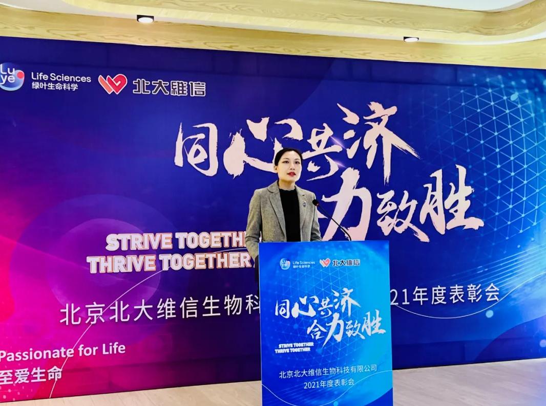 綠葉生命科學(xué)集團(tuán)資深副總裁薛云麗女士通過(guò)視頻錄播的形式,將對(duì)北大維信過(guò)去一年業(yè)績(jī)的鼓勵(lì)和肯定,對(duì)北大維信未來(lái)的寄語(yǔ)和展望帶到了北大維信總結(jié)表彰現(xiàn)場(chǎng)。