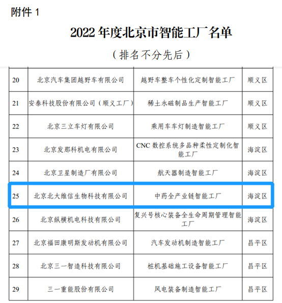 2022年11月25日,北京市經(jīng)濟(jì)和信息化局公布了2022年度北京市智能工廠和數(shù)字化車間名單。北大維信通過了2022年度北京市智能標(biāo)桿企業(yè)復(fù)核,入選2022年度北京市智能工廠。